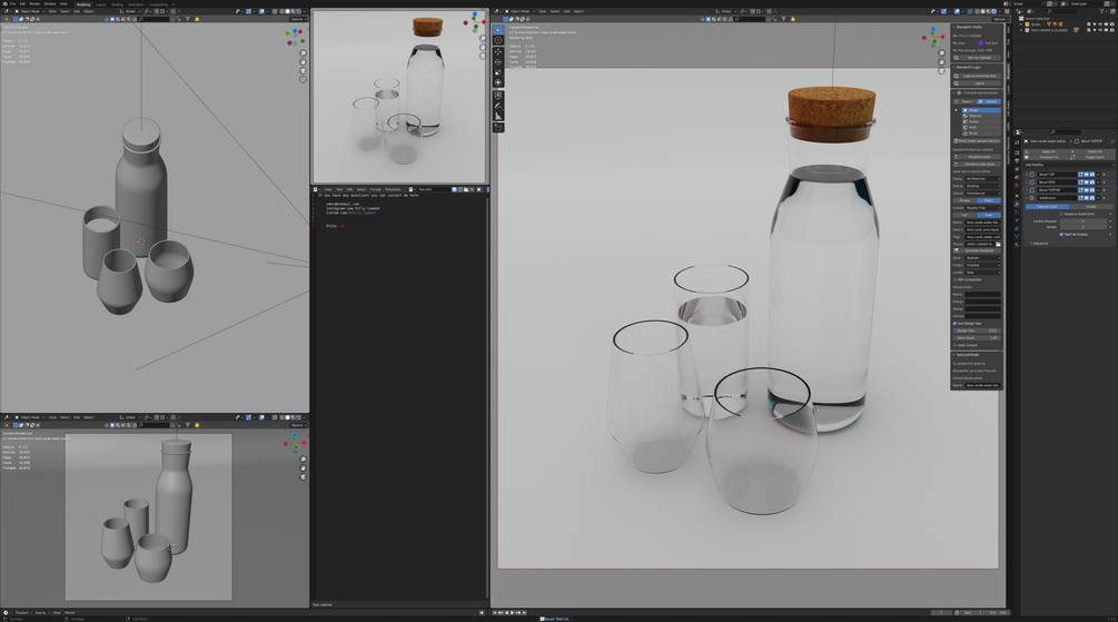 Ikea carafe water bottle and selection of three glasses. Bottle full of clear liquid, perhaps water and one of the glasses is also full of the same liquid.
